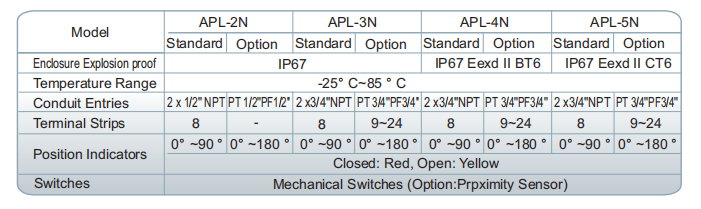 Caractéristiques des interrupteurs de fin de course de la série APL :